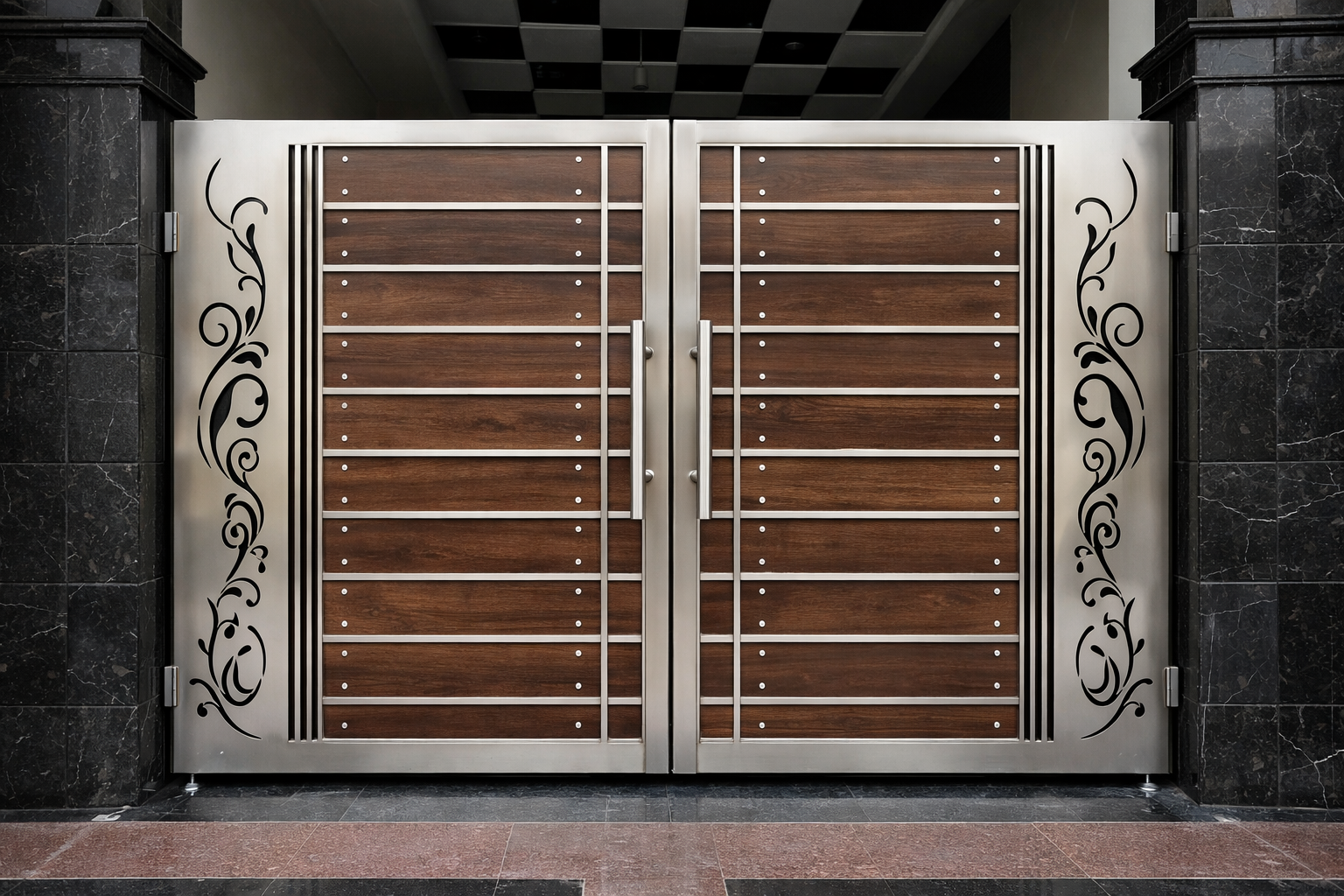 Designed for both residential and commercial entrances, this hybrid gate features precision fabrication and expert finishing. The wood inserts are carefully integrated into the steel structure to ensure stability, seamless design, and lasting performance. The natural wood tones contrast elegantly with the polished steel, resulting in a contemporary yet classic look.